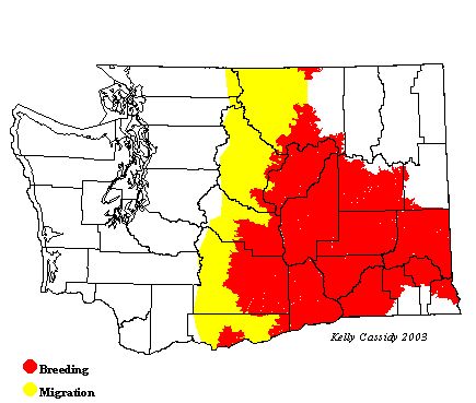 Swainson's Hawks are fairly common summer residents in higher grasslands in most of eastern Washington. Most arrive by mid-April and leave in late August or early September. During migration they are sometimes seen in the Cascade Mountains.