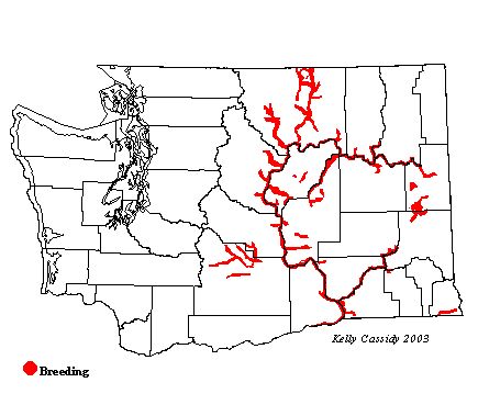 White-throated Swifts are common at lower elevations in eastern Washington, including Ponderosa pine and steppe zones. They are typically found breeding along major rivers and coulees, including the Columbia, Yakima, and Spokane Rivers, and Grand and Moses Coulees. They are also found in the southeastern Blue Mountains. The central Columbia Basin, with its many coulees and cliffs, is the area of highest density in Washington. White-throated Swifts arrive in these areas in late March and leave by mid-August.