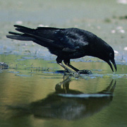 Outside the breeding season, Northwestern Crows are quite sociable, roosting and foraging in large flocks. They are intelligent and opportunistic, and quickly take advantage of new sources of food. They generally feed on the ground or in shallow water. They drop hard-shelled items onto hard surfaces, such as rocks and roads, to break them open. Northwestern Crows foraging in intertidal areas often store extra food during low tide, when it is plentiful, and consume it during the following high tide, when the intertidal zone is under water.
