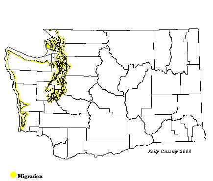 This common, coastal migrant may number in the tens of thousands in Grays Harbor during the spring migration peak. Willapa Bay is another major stopover point in spring. These two sites are the only spots where large numbers usually congregate in the spring, but smaller numbers may be scattered in other spots along Washington's outer coast as well. The spring influx of birds usually starts with a few birds at the end of March, and lasts into early May. They are common from early April to early May, peaking at the end of April. By mid-May, they have tapered off considerably and are rarely seen. By late June, they start becoming more common as the fall migration begins. The peak southerly movement of adults is from the end of June to mid-July, with numbers tapering off and blending into the August and early September peak migration juveniles. Numbers vary greatly, and in some years, fewer than a thousand birds are counted. The birds that migrate through Washington breed in Alaska and winter on the Pacific Coast south of Washington. Some first-year birds stay on the wintering grounds, or migrate only as far as Washington for the summer. Migrants in eastern Washington are never common. They can be seen occasionally in spring, and rarely in fall, at large wetlands in the Columbia Basin. While some birds summer at Grays Harbor and Willapa Bay, wintering birds are very unusual, and care should be taken not to misidentify Long-billed Dowitchers, which are much more common in Washington in winter.